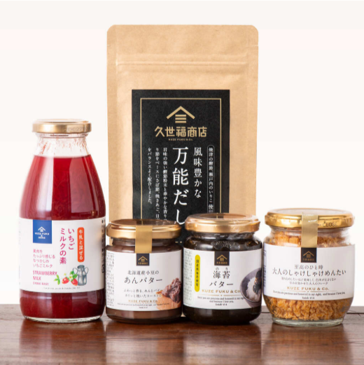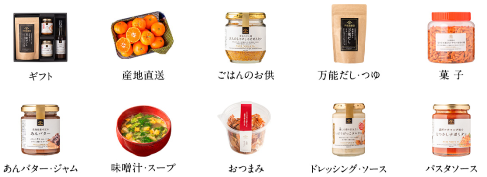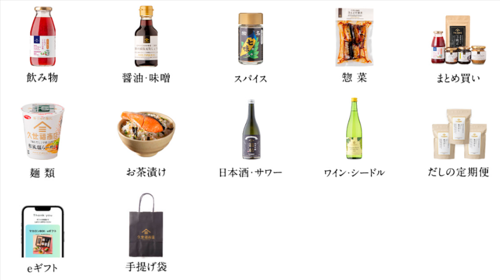 【おなじみの万能だしをはじめとする調味料やお酒、お菓子、珍味など】