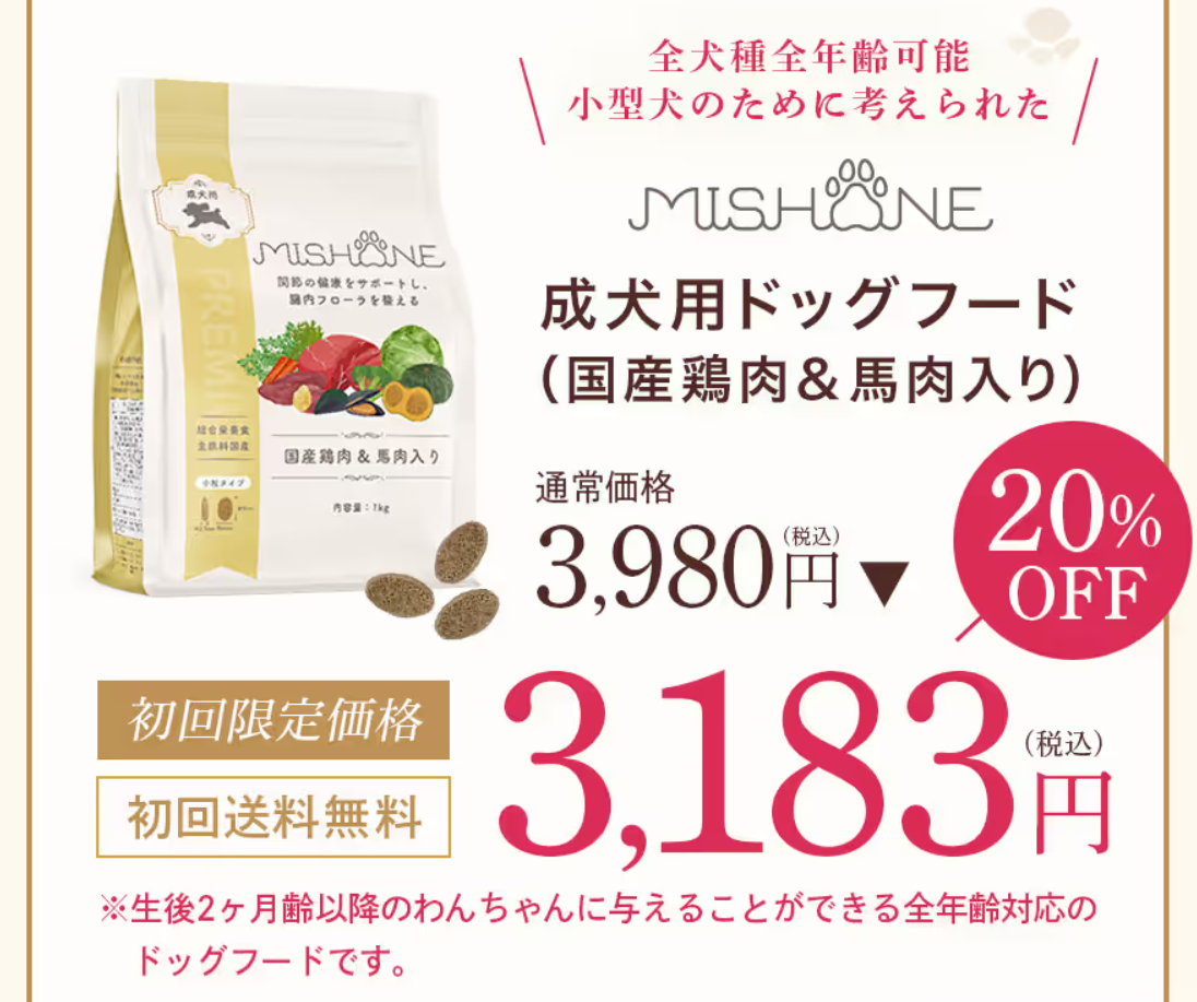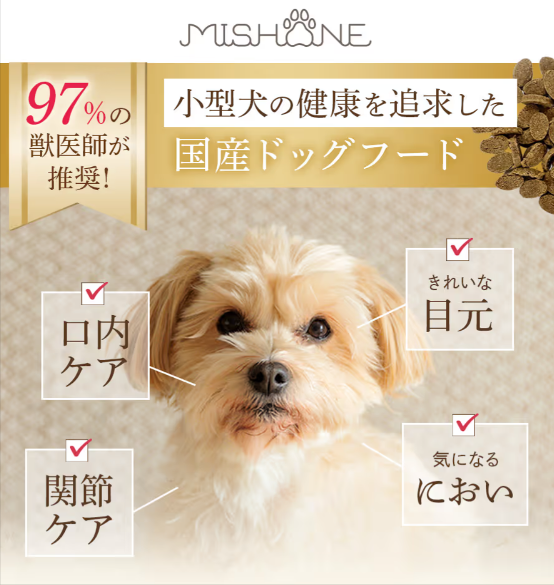 小型犬は関節疾患が多いといわれています。関節の健康維持をサポートしてくれる食材の一つが ”奇跡の貝” といわれる『緑イ貝』です。緑イ貝はグルコサミノグリカンや、元気な歩みに欠かせない成分オメガ3脂肪酸を豊富に含み、関節機能の維持をサポートしてくれます。さらに、高たんぱくでカルシウムが豊富な馬肉で免疫力向上、DHA・EPAを含むまぐろで涙やけ予防&毛並み改善、国内産8種類の雑穀と12種類の野菜、3種類の海藻、大麦、玄米にでつくられる1億2000個の乳酸菌で腸内フローラを整える効果が期待できるそうです!